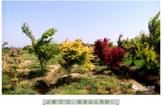 傳統(tǒng)色塊,無非綠,紅,黃三種顏色,“金禧”從萌芽到葉片成熟綻放,會(huì)經(jīng)歷多個(gè)變色階段,所以色塊隨著新葉的生長,會(huì)呈現(xiàn)多種色彩效果,并且層次遞進(jìn)是其他任何色塊苗木無法比擬的。